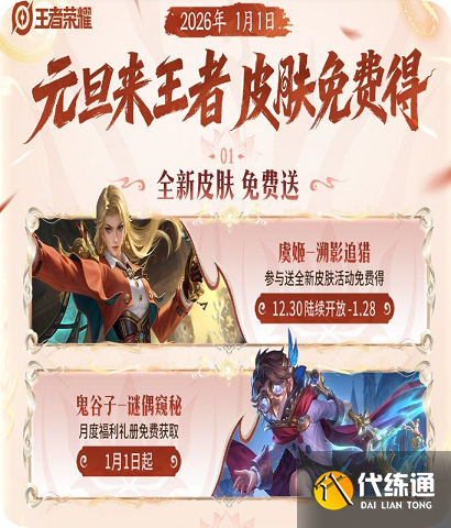 元旦节有4款皮肤和1款元流时装上线。虞姬“溯影追猎”12月30日 - 1月28日参与活动免费领;鬼谷子“谜偶窥秘”1月1日起在月度福利礼册免费获取;安琪拉“糖果风暴”1月1日 - 1月7日60限时点券限时秒杀;蒙恬“苍云破阵”是挑战者杯限定皮肤,1月2日 - 1月8日60点券限时秒杀,后续不再直售返场。1月1日元流时装“春令白景”上架星币商城,具体兑换星币数等官方公告。