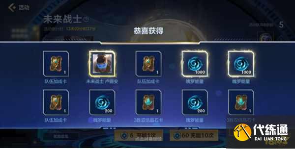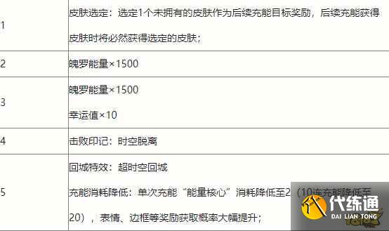 2、充能奖励:充能1次消耗“能量核心”×6(充能10次消耗60),每次充能随机获得1份奖励(充能10次获得10份),包含皮肤、表情、边框、魄罗能量等丰富内容;