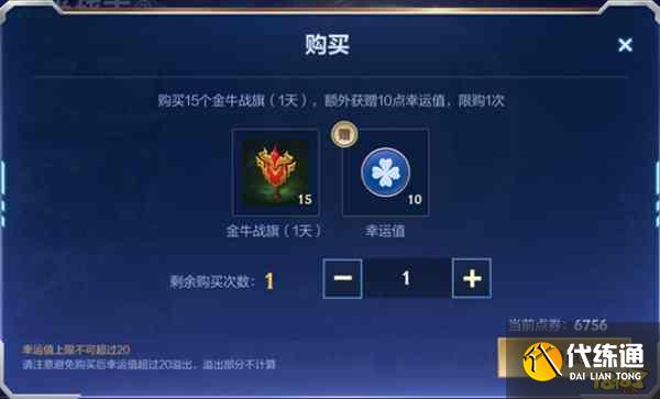 7、获赠幸运值:助力快速获取皮肤,消耗150点券购买金牛战旗(1天)*15可直接获赠【幸运值×10】,活动期间限购1次,幸运值上限为20,建议在充能前购买,避免购买后幸运值超过20(溢出部分不会计入);