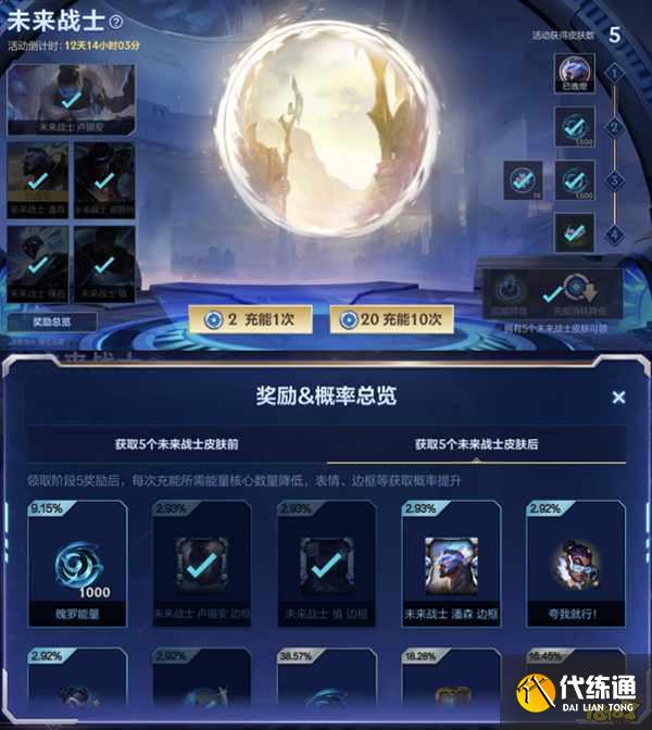 充能消耗降低:拥有全部5个未来战士系列皮肤时可领取,领取该奖励后,单次充能“能量核心”消耗降低至2(10连充能降低至20),同时表情、边框等奖励获取概率将大幅提升(想获取全部个性化道具奖励的玩家不要错过哦),详细奖励和概率可查看“奖励总览”界面第二页内容;