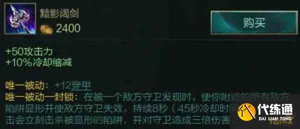 1、在手游中塞纳的核心装备是暗影阔剑,它是塞纳第一件要出的装备,首先是它的属性非常符合塞纳,增加攻击力和冷却缩减,而且被动可以周期性的暴露敌方视野,起到排眼的作用;