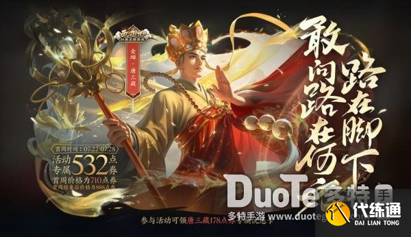 7月21日更新后-7月28日23:59期间,还可在“累计对局-送金蝉宝箱”活动中,领取唐三藏专属178点券优惠卡,首周最低532点券即可购买。