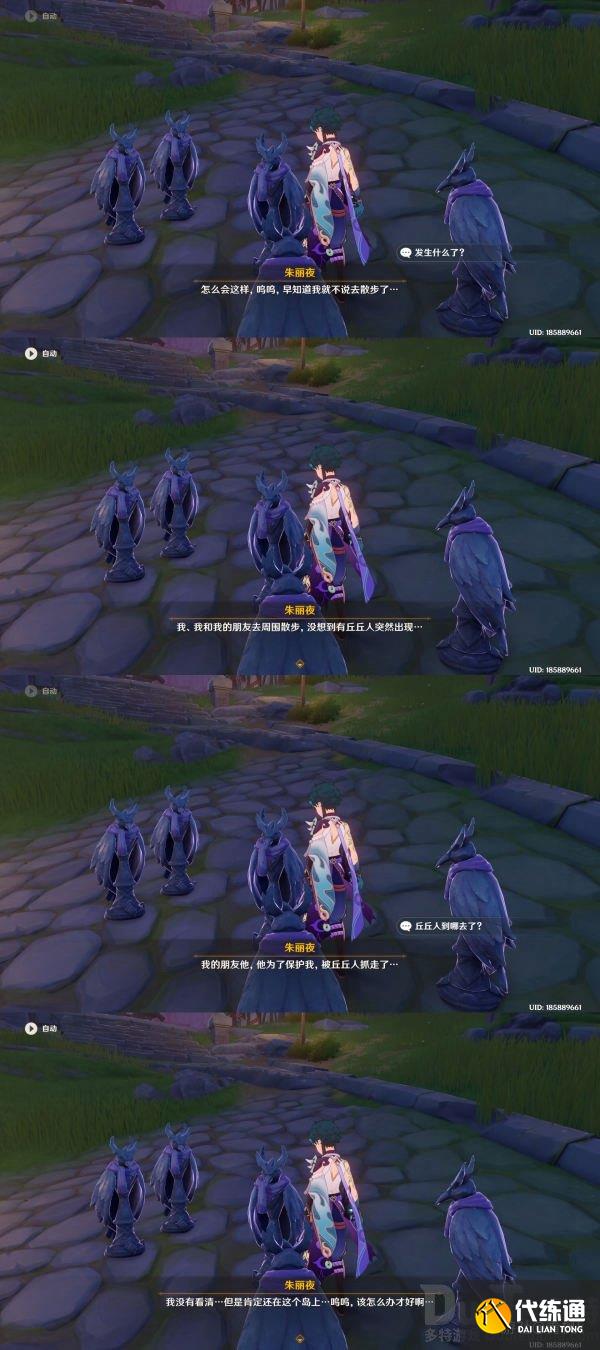 在下坡处会看到几只围在一起的夜鸦雕像,交谈得知鸦蜜欧失踪了,就在这座岛上的某个地方,如果没有就退出游戏重新登陆