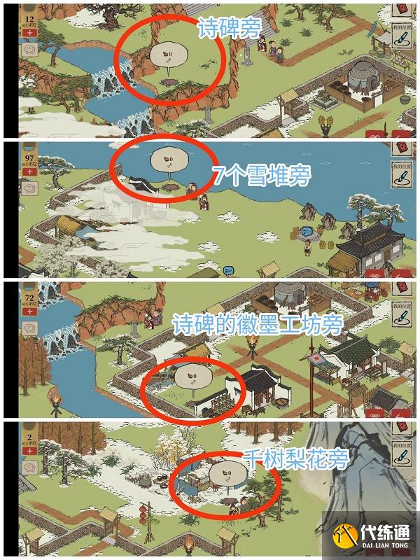 诗碑旁;7个雪堆旁;徽墨工坊旁 ;千树梨花旁(被松树挡住了)