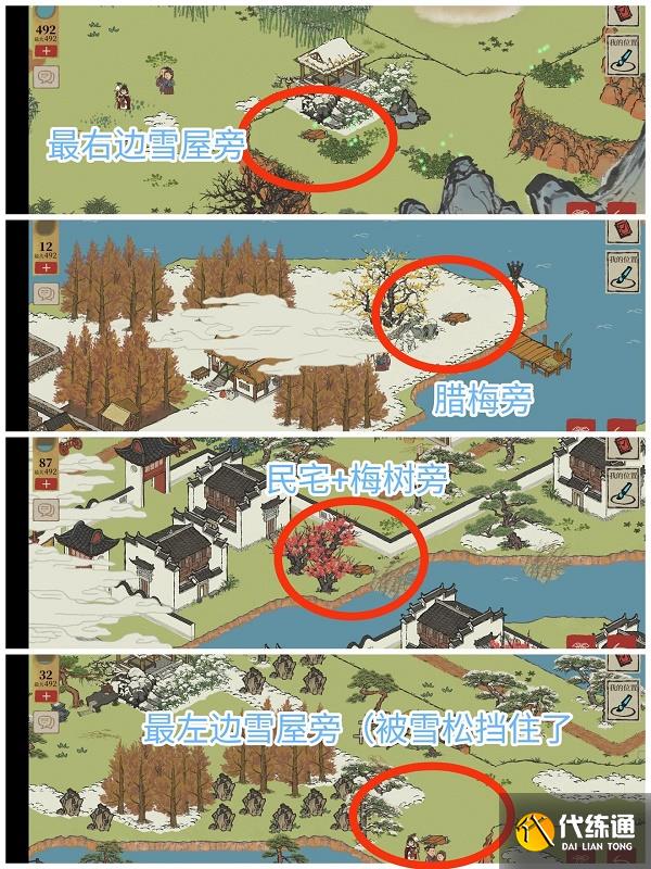 最右边雪屋旁;腊梅旁;民宅+梅树旁;最左边雪屋旁(被雪松挡住了)