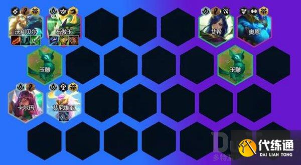 看自身经济与连胜情况选择在3-5或4-1升级7人口,开始大D卡找到石傲玉与奥恩,开6玉龙+3尊+3半神。阵容小成,之后看自身血量与经济,经济好准备升8,经济差就在7级卡着30金币追沃利贝尔3星吗,顺带可D艾尼维亚3星。