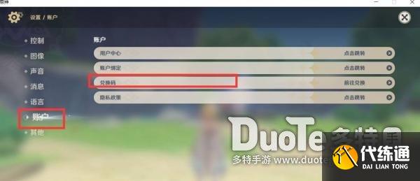 3、在设置界面中,点击进入账号界面,就可以看见兑换码