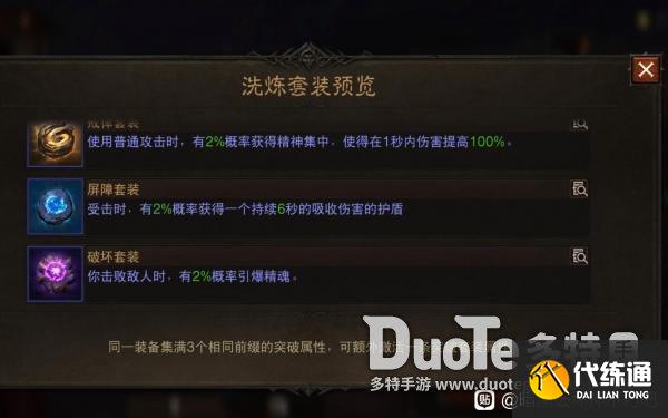 一件装备上的3个突破属性为同一前缀系列时,可以激活额外的套装奖励。