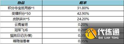 皮肤碎片&积分自选礼盒:打开礼包可任意选择以下奖励之一:荣耀积分*10或皮肤碎片*1
