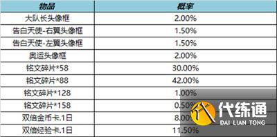 打开后可随机获得以下奖励之一:大队长头像框、告白天使-右翼头像框、告白天使-左翼头像框、奥运头像框、双倍金币卡:1日、双倍经验卡:1日、铭文碎片*158/128/88/58。
