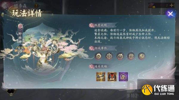 ※错季森:大人们可以消耗60点体力进入错季森,选择试炼式神开启挑战。本期开放的试炼式神为:青行灯、姑获鸟、三尾狐。大人们挑战错季森成功后,将根据评分获得相应奖励,包括试炼式神专属头像框及聊天气泡「四时归焉·明灯」、「四时归焉·伞剑」、「四时归焉·狐媚」;御行达摩碎片、勾玉等。