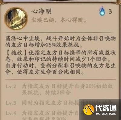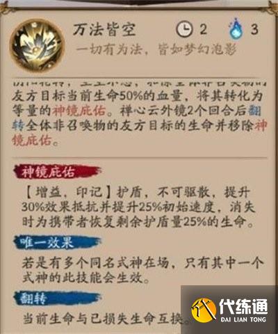 3、禅心云外镜2个回合后翻转全体非召唤物的友方目标的生命并移除神镜庇佑。