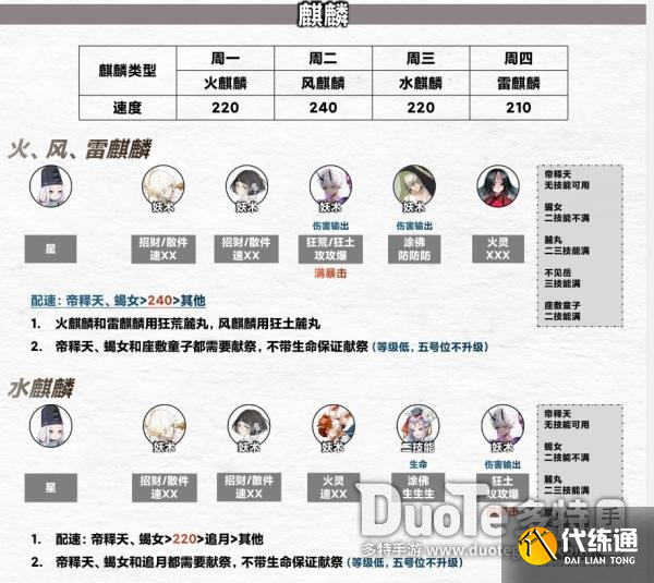 周一火麒麟,周二风麒麟,周三水麒麟,周四雷麒麟