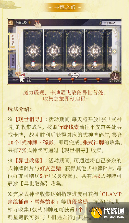 ※【现世相寻】:活动期间,每天将开放1张「式神牌」的收集战斗。按照行踪线索前往平安京各处寻找卡牌,战斗胜利后获得对应的式神牌碎片,集齐10个/式神牌·碎影」即可完成1张式神牌的收集。共有7张式神牌可通过【现世相寻】收集。