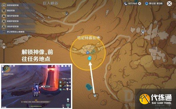跟随指引,我们从【饱饮之丘】东边锚点前往塔尼特露营地,途中最好先开启七天神像,这样地图就能看清了。