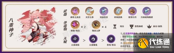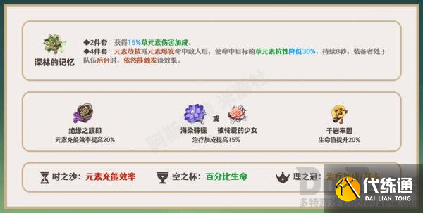 2. 除此之外可以选择提高充能效率的绝缘2件,提高治疗量的海染或少女2件,也可以考虑千岩牢固等圣遗物搭配。