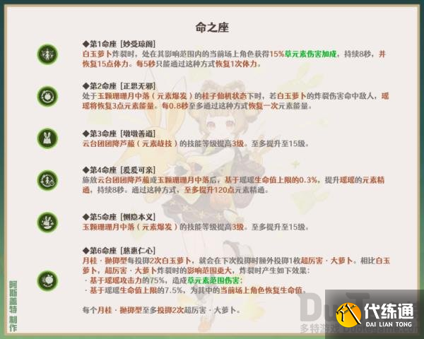 ◆总的来说,作为4星角色而言,命座是越高越好,如果像解放大招充能循环,则最好是解锁至2命降低大招启动需求,再者则是解锁至满命瑶瑶提升大招的草元素施加能力。