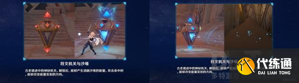 【解法解释】符文机关一共四面,同时只有一面可以发动技能驱散沙堆,打一下机关即可使技能面转换位置