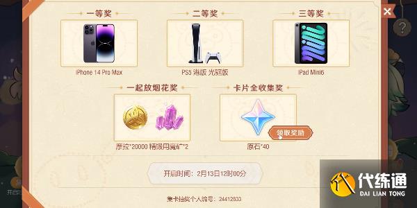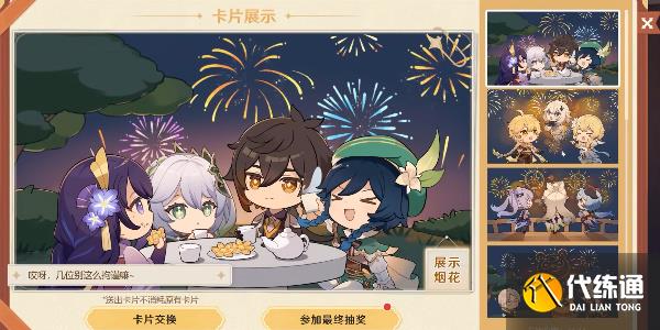 收集全部十一张卡牌后,即可领取原石等游戏奖励。 除参与烟花抽奖时抽取到的奖励之外,所有参与烟花抽奖的旅行者都将得到摩拉、精锻用魔矿等额外游戏奖励。