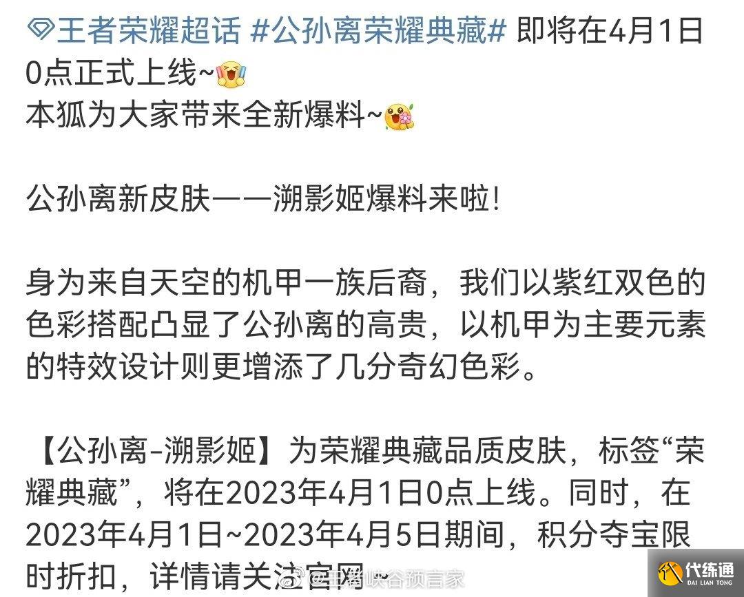[公孙离-溯影姬]为荣耀典藏品质皮肤,标签“荣耀典藏”将在2023年4月1日0点上线。同时,在2023年4月1日~2023年4月5日期间,积分夺宝限时折扣,详情请关注官网~