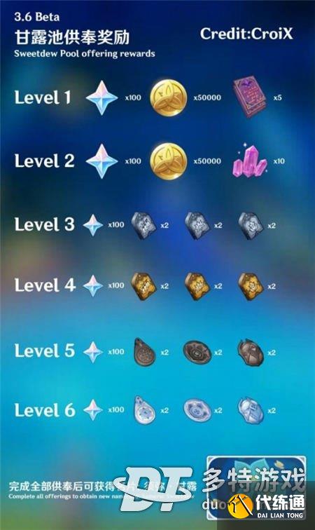 甘露池是原神3.6版本更新后推出的新供奉点,一共10个等级,每次升级均可获得对应奖励,参见上图。主要升级材料为“净光翎”。