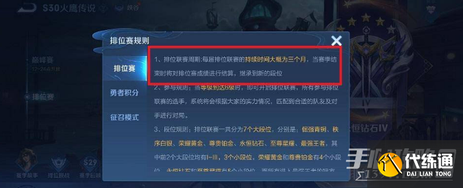 3、王者每个赛季大约会持续3个月左右,玩家们可以在赛季期间参与排位赛提升自己的段位;