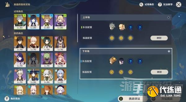 第五天的关卡选择积分倍率×1,只使用试用角色的阵容和振晶配置如下图所示。上半场的输出手法为:菲谢尔战技或爆发挂奥兹→艾尔海森战技普攻/爆发普攻;下半场的输出手法为:夜兰战技/爆发普攻→瑶瑶战技/爆发普攻。