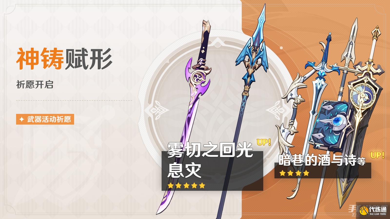 亲爱的旅行者,「神铸赋形」活动祈愿即将开启,「长柄武器·息灾」「单手剑·雾切之回光」概率UP!