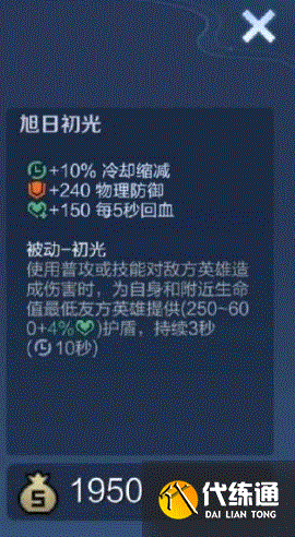 “旭日初光”对于辅助英雄来说,几乎就是神装的存在,护盾效果与救赎类似,但是救赎的冷却时间更长,有60秒的时间,另外,装备的护盾量是依据出装者的最大生命值算的,对局后期一个辅助英雄的血量一般都在10000以上,因此加盾效果非常可观。