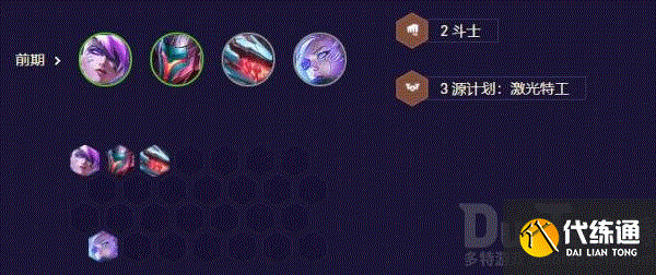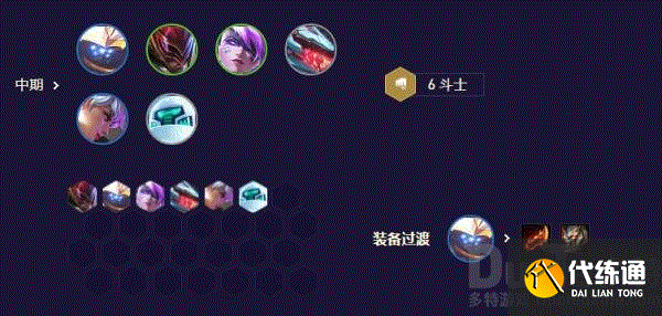 如果锐雯或武器出的早,又或是肉装开局,尽量先做4斗士,配日炎或者泰坦,后续再补充2枪手或2决斗,也可以上德莱文开机甲过渡。中期可以直接开6斗士武器带狼人装备。