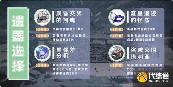 主词条方面,头部和手部为固定的生命值和攻击力属性,躯干选择暴击率,脚部选择击破特攻或速度,位面球选择风属性伤害提高或攻击力,连结绳选择攻击力。