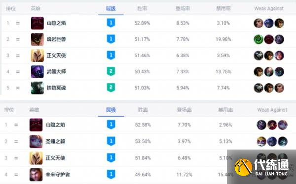 从数据变化我们能看出,奥恩是从上个版本变猛的,具体原因大木并不是很了解,因为13.8版本没有对奥恩进行任何改动,坦克装备部分也是没有改动的,但奥恩就是突然间崛起了,并且一直保持到13.9版本还是那么强势。