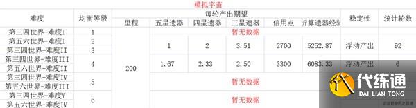 楼主个人认为,同一均衡下所有遗器类的产出是同一种掉落期望,譬如:第六世界·模拟宇宙-难度I 与 第三世界·模拟宇宙-难度II 与 睿治之径·侵蚀隧洞-难度III 应该是同一种掉落期望。故表中暂时合并了同一类掉落,需要更多数据其验证这一结论。
