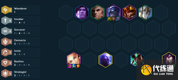 2、构成羁绊:4法师、4神谕、3德玛、3艾欧尼亚、2战略家、2壁垒