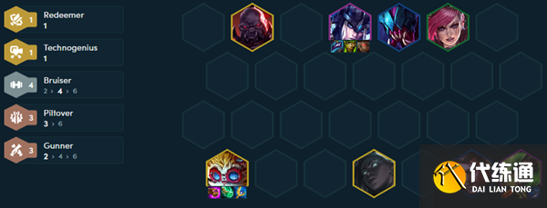 2、构成羁绊:4枪手、4格斗、3皮城、2祖安、1发明、1涤魂