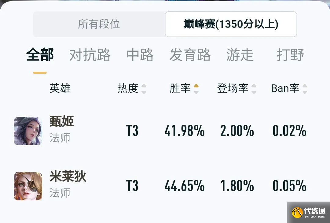 除此之外,就是甄姬和米莱迪了,全段位胜率47.92%,巅峰赛胜率41.98%。不稳定的控制加上位移技能的缺失使得甄姬出场几乎就成了对面打野的提款机,全英雄胜率倒数第一的存在,甄姬现在是真的稳坐下水道了。