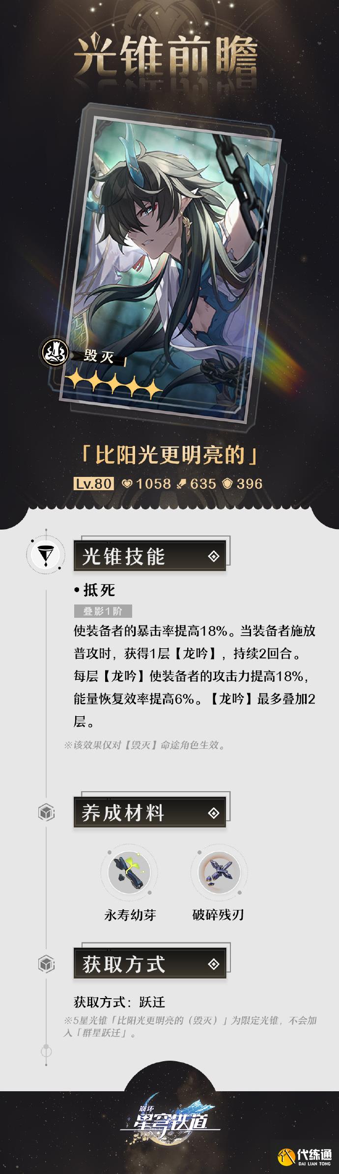 5星光锥「比阳光更明亮的(毁灭)」为限定光锥,不会加入「群星跃迁」。