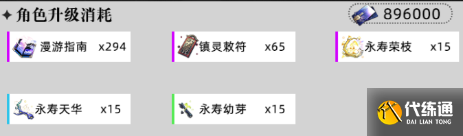 角色升级消耗需要漫游指南294,镇灵敕符65,永寿荣枝15,永寿天华15,永寿幼芽15。