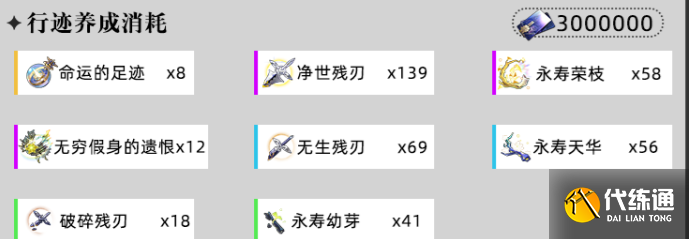 行迹养成消耗需要命运的足迹8,净世残刃139,永寿荣枝58,无穷假身的遗恨12,无生残刃69,永寿天华56,破碎残刃18,永寿幼芽41。
