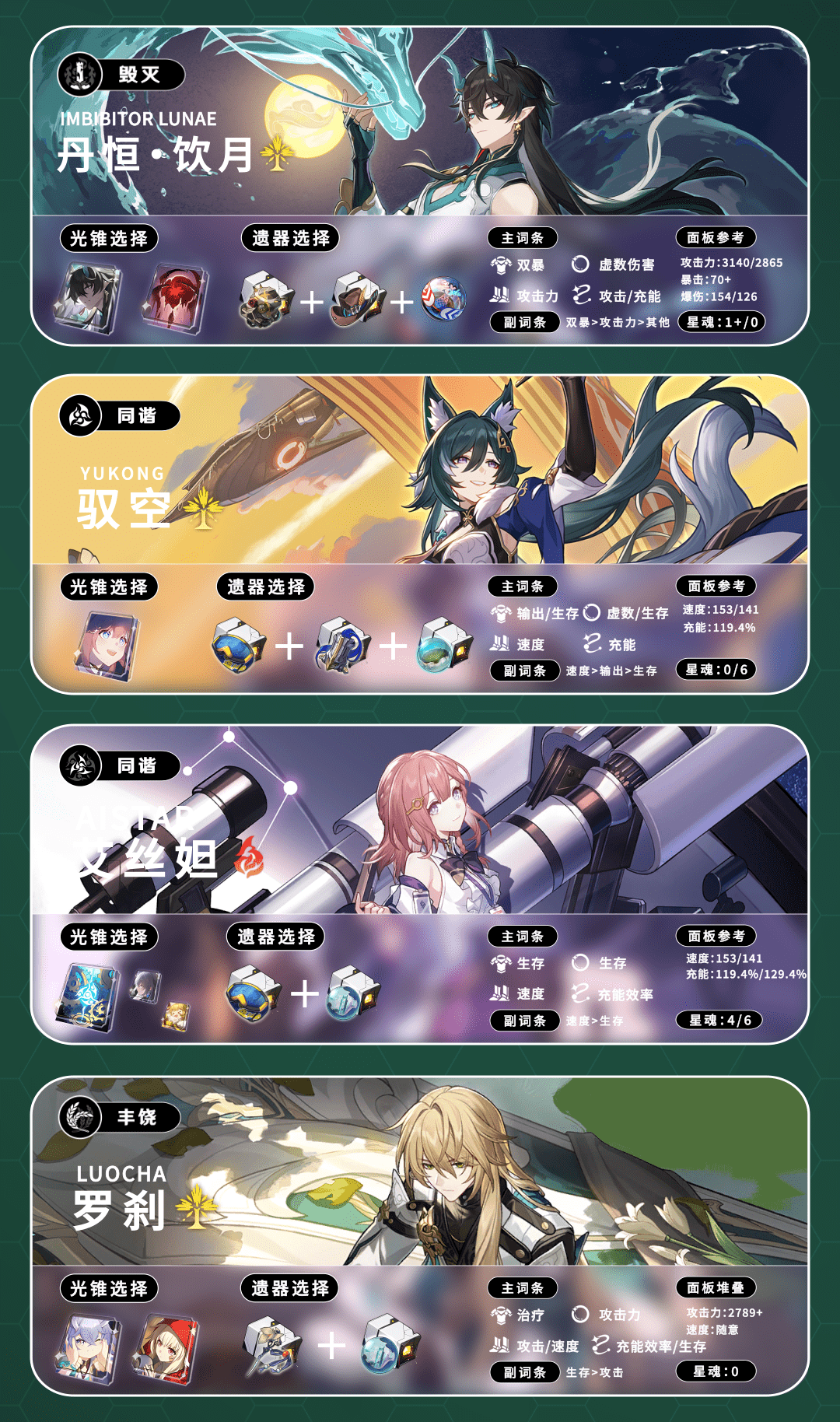 进阶一点的配队思路,就是通过提高辅助的速度,达到一轮多次的行动来为饮月君装备充足的战技点。
