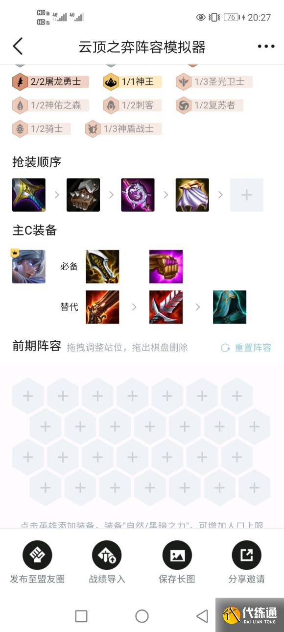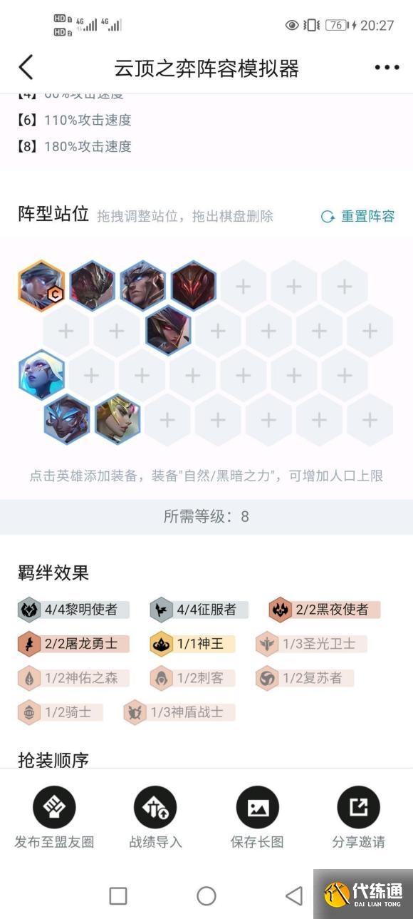 7人口凑了一下,阵容为瑞文,酒桶,风男,星妈,豹女,铁男,剑魔。此时羁绊为4黎明4征服