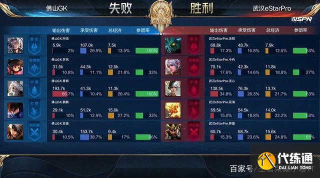 第一个就是最近刷新的输出数据,一般来说一个队伍输出最高的不是中路就是射手,一般在30%左右就是合格,40多就是爆炸输出,但GK的青枫姜子牙在一局20分钟左右的比赛当中居然打出了66.7%的伤害,可以说是输出爆炸。但就算是这样GK还是输给了eStar,只能说是独木难支吧。