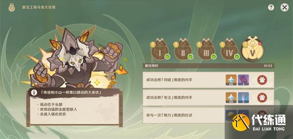 原神5.3版本中新增了一个叫做“漱玉工奇斗虫大玄境”的挑战,第五天的斗虫对手是传说和小山一样难以撼动的大家伙。一些玩家不清楚如何成功获得全部奖励,所以为了帮助到各位,小编为各位带来了原神漱玉工奇斗虫大玄境第五天如何拿满奖励的攻略,希望能对你有所帮助。