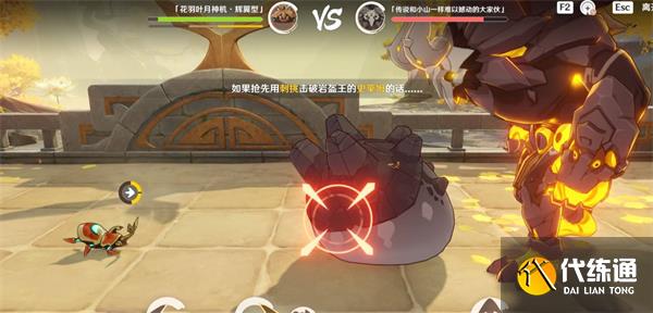 在岩盔王抛投岩史莱姆时,及时击打史莱姆能打断岩盔王的攻击并减少它的伤害。注意,史莱姆会在一段时间后失去弱点标记,但依然可以继续攻击史莱姆,确保它爆炸时能对岩盔王造成额外伤害。