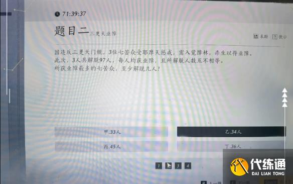 2、问题:因违反三更天门规,3位七苦众受耶摩天惩戒,需入觉障林,杀生以得业障此次,3人共解脱97人,每人均获业障,且所解脱人数互不相等。所获业障最多的七苦众,至少解脱几人?