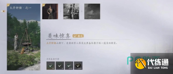 首先大家先前往太平钟楼上找到NPC蔡菜,和他对话后得知,他想做一道菜当做惊喜给妻子,但是还缺少了蘑菇、火鸡这两样材料,并且做饭用的火折还被人抢走,需要我们帮助找到。