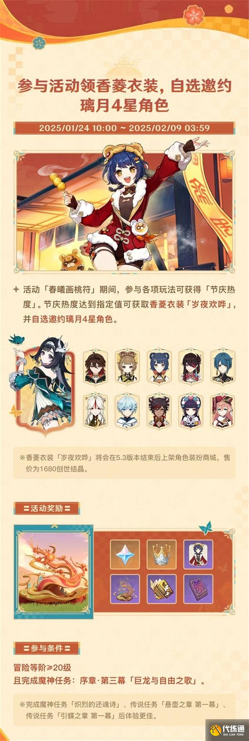 ?春曦画桃符?:1月24日至2月9日,参与各项玩法可获得“节庆热度”,达到指定值可获取香菱衣装“岁夜欢哗”并自选邀约璃月四星角色?。
