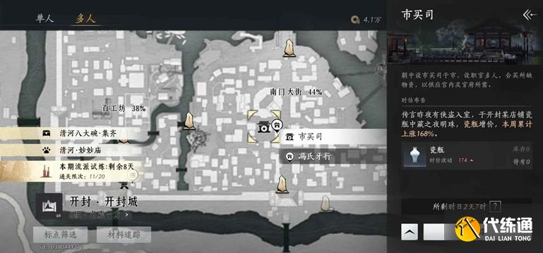 比较重要的地点有两个,见p1,一个是市买司找张祺越(可以卖出货物以及查看商品波动),一个是冯氏牙行找冯诚(基本上货物都可以在这里买)。还有一些地方如灯笼铺和猪肉铺,都可以在市买司的商品波动公告里面点击前往购买就可以追踪啦!