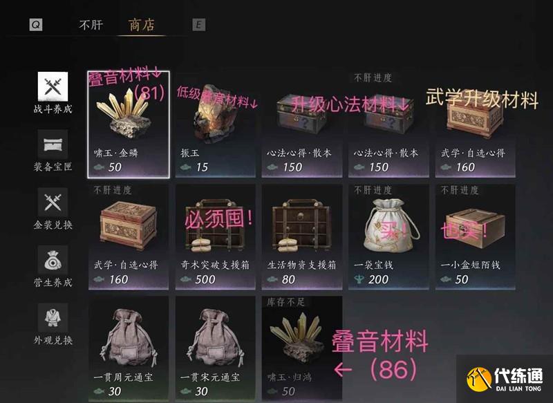 心法心得无论你觉得有没有用要买空。武学升级材料觉得不是很缺可以不买。