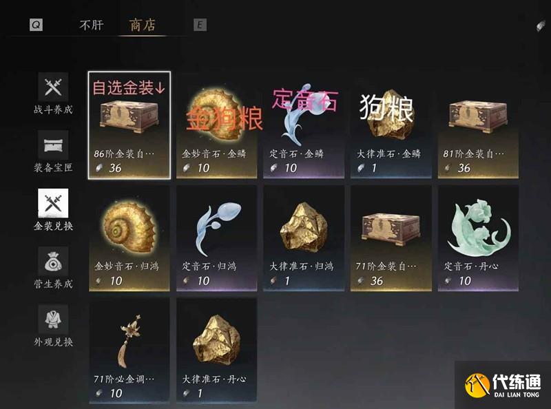 自选金装、金狗粮、狗粮、定音石 都是用装备残片来买的,赛季初期碎片少,赛季后期可以用来买刷不出的装备和调率不够好的装备。